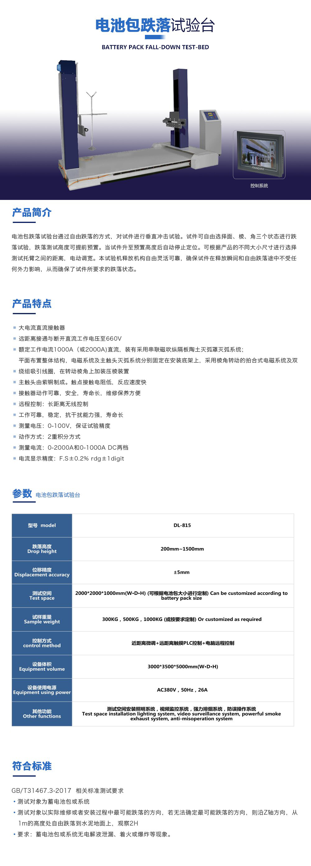 用途:電池包跌落試驗臺通過自由跌落的方式,對試件進行垂直沖擊試驗。試件可自由選擇面、棱、角三個狀態進行跌落試驗,跌落測試高度可提前預置。當試件升至預置高度后自動停止定位
